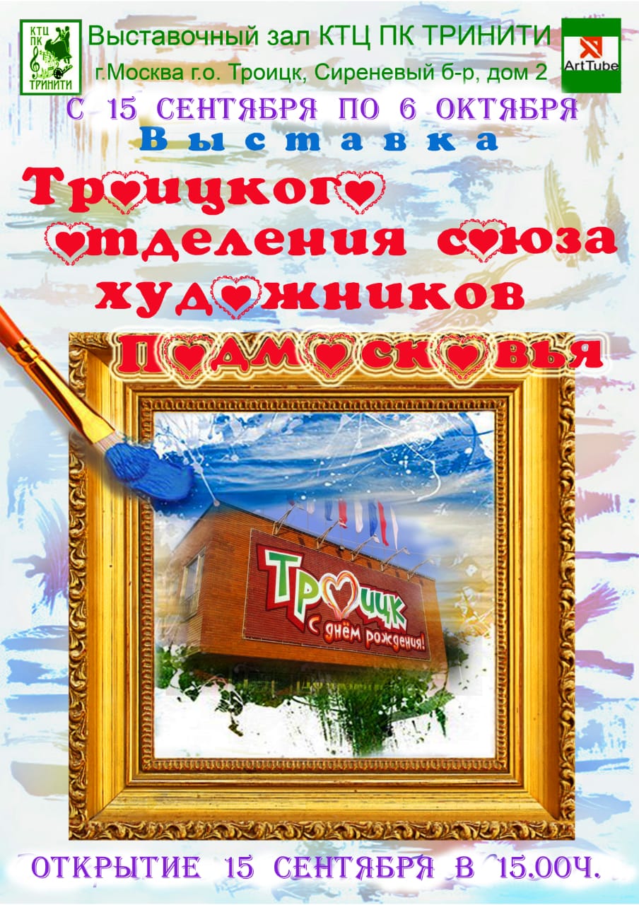 Выставка Троицкого отделения Союза художников Подмосковья Выставка Троицкого отделения Союза художников Подмосковья. С 15 сентября по 6 октября 2019г. Выставочный зал КТЦ ПК ТРИНИТИ. Москва, Троицк, Сиреневый бульвар, дом 2. Вернисаж 15 сентября в 16:00.