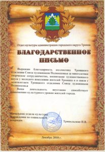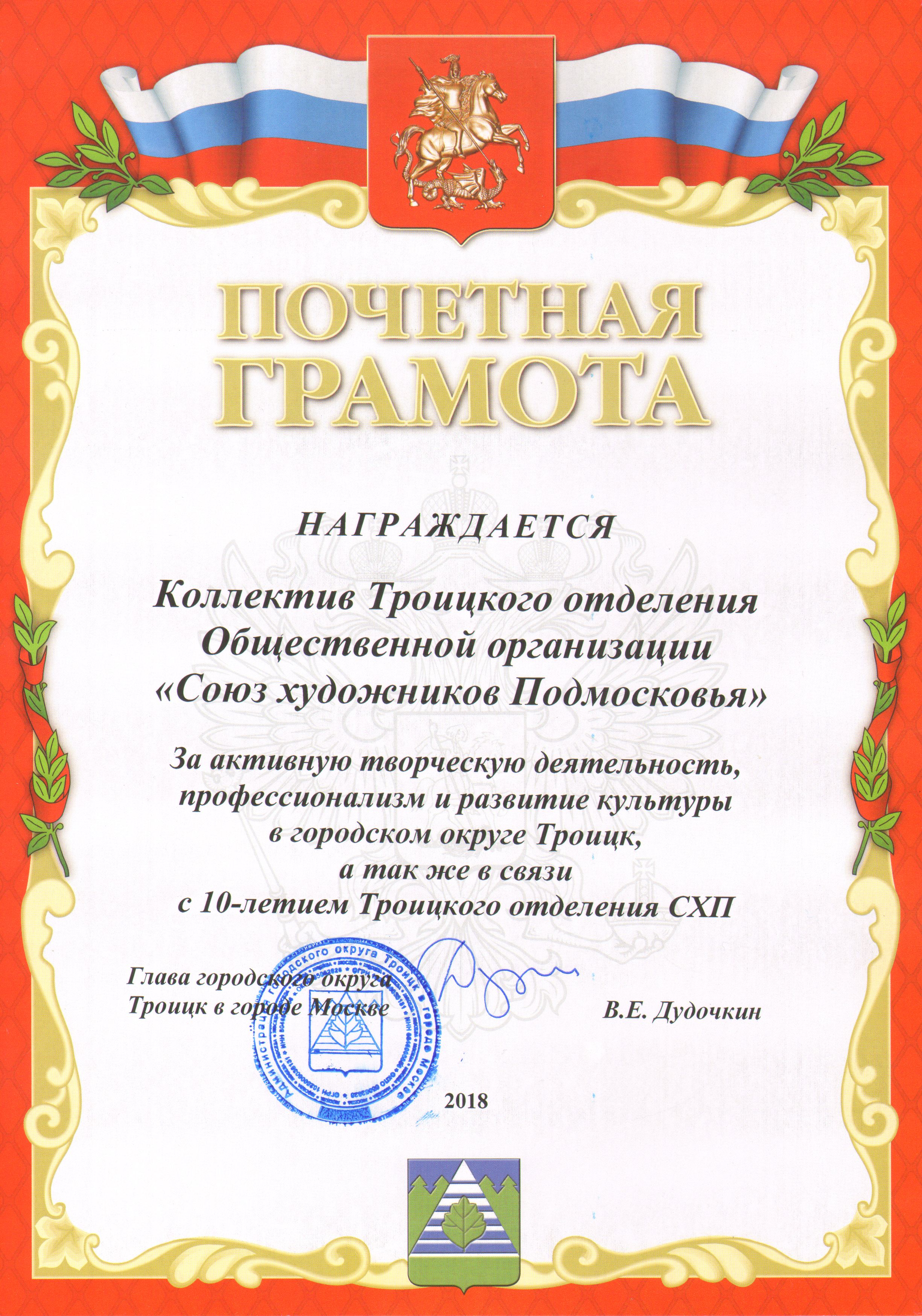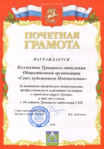 Отделение СХП отмечает в эти дни свое 10-летие с момента образования в 2008 году. На торжественном открытии глава городского округа Троицк в городе Москве Владимир Евгеньевич Дудочкин вручил грамоту коллективу Троицкого отделения Общественной организации «Союз художников Подмосковья» за активную творческую деятельность, профессионализм и развитие культуры в нашем городе.
